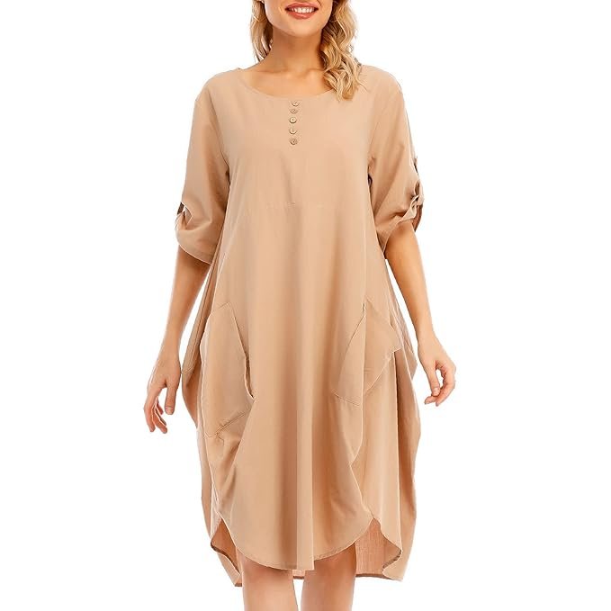 Belity Women Tunic Dress Roll-up Short Sleeve Comfortable Cotton Pockets Irregular Hem Solid Baggy Midi Dress