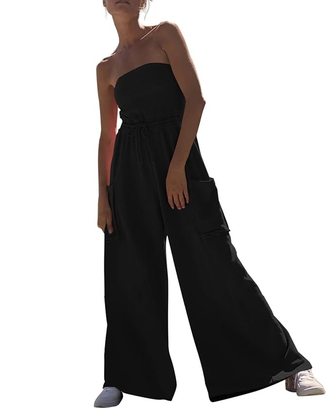 Off shoulder, backless, bandeau, elastic waistband, drawstrings, wide leg style, long pants with pockets, sexy jumpsuit. Strapless jumpsuits for women are effortlessly sporty and stylish. No lined, but not see-through. You’ll love wearing this look all day long!