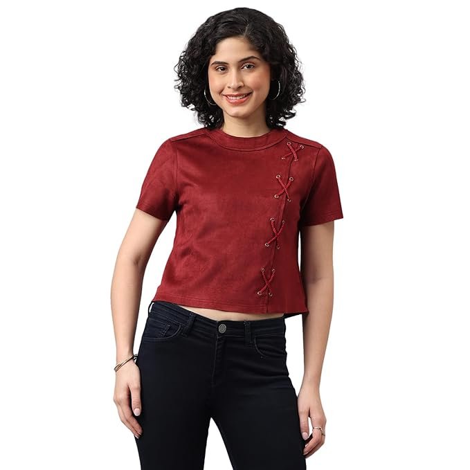 Product Features-: Material-: Polyester Stretch | Color-: Maroon | Sleeves Length-: Short Sleeves | Neck Type-: Round Neck | Pattern Type-: Solid | Fit Type-: Regular Fit