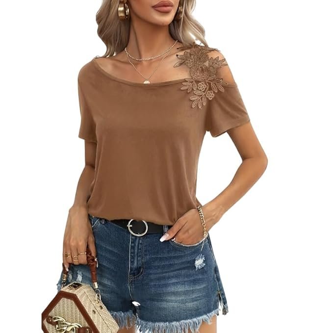 MIPPO® Women’s Cold Shoulder Top with Asymmetrical Cut-Out Lace & Casual Short Sleeves