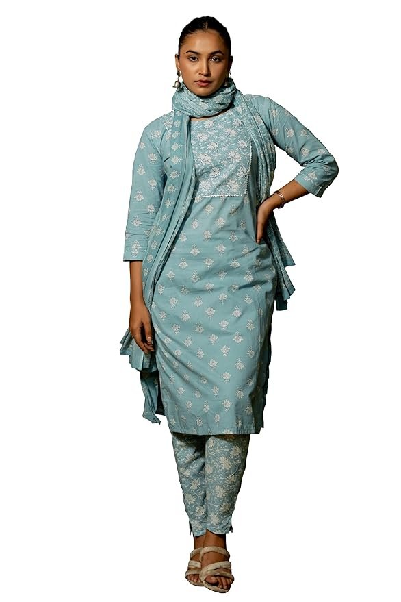 • Color: : Top- Dusty Turquoise, Off White; Bottom- Dusty Turquoise, Off White; Dupatta- Dusty Turquoise, Off White|| Fabric: : Top- Pure Cotton; Bottom- Pure Cotton; Dupatta- Pure Cotton