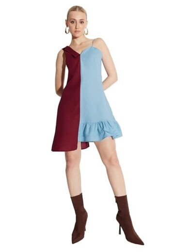 Mismatchd Regular Solid V Neck, Sleevless Linen Cotton Dress for Womens