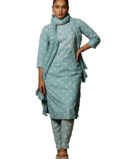 MIRCHI FASHION Women's Straight Fit Pure Cotton Mix Floral Printed Embelished Kurta Set with Dupatta and Trouser