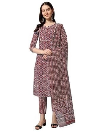 MIRCHI FASHION Women's Stylish Straight Fit Cotton Ajrak Motif Printed Kurta Set with Trouser Pant and Dupatta