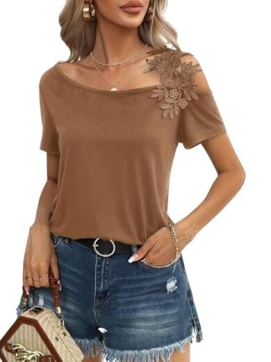 MIPPO® Women’s Cold Shoulder Top with Asymmetrical Cut-Out Lace & Casual Short Sleeves