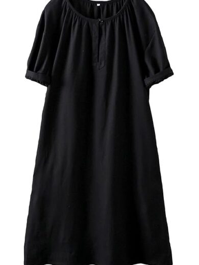 Minibee Women's Cotton Linen Dress Short Sleeve Midi Casual Tunic Dress with Pockets Black 2XL