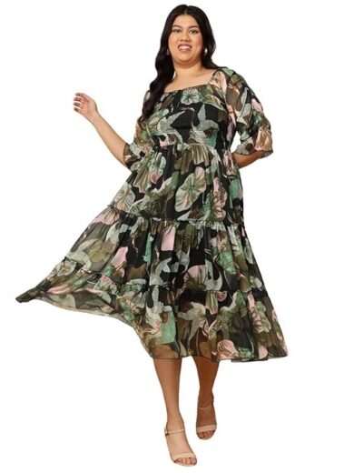 DEEBACO Duck Printed Chiffon Fit & Flare Midi Plus Size Dress for Women's |Square Neck 3/4 Puff Sleeves|Summer Western Party Casual Wear Dress for Ladies (Multicolor)
